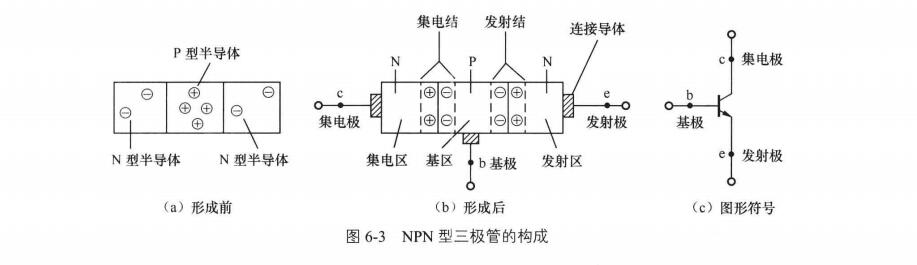 NPN型三极管的构成与PNP型三极管类似,它是由两个N型半导体和一个P型半导体构成的,具体如图6-3所示。